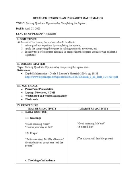 Mathematics Lesson Plans Grade 9 Gauteng Province
